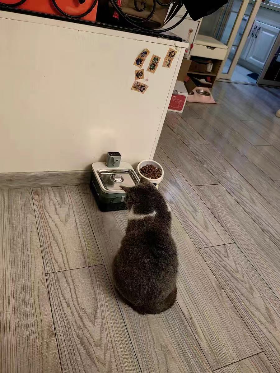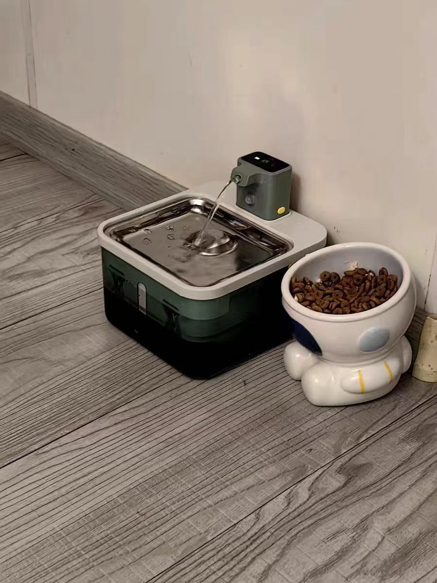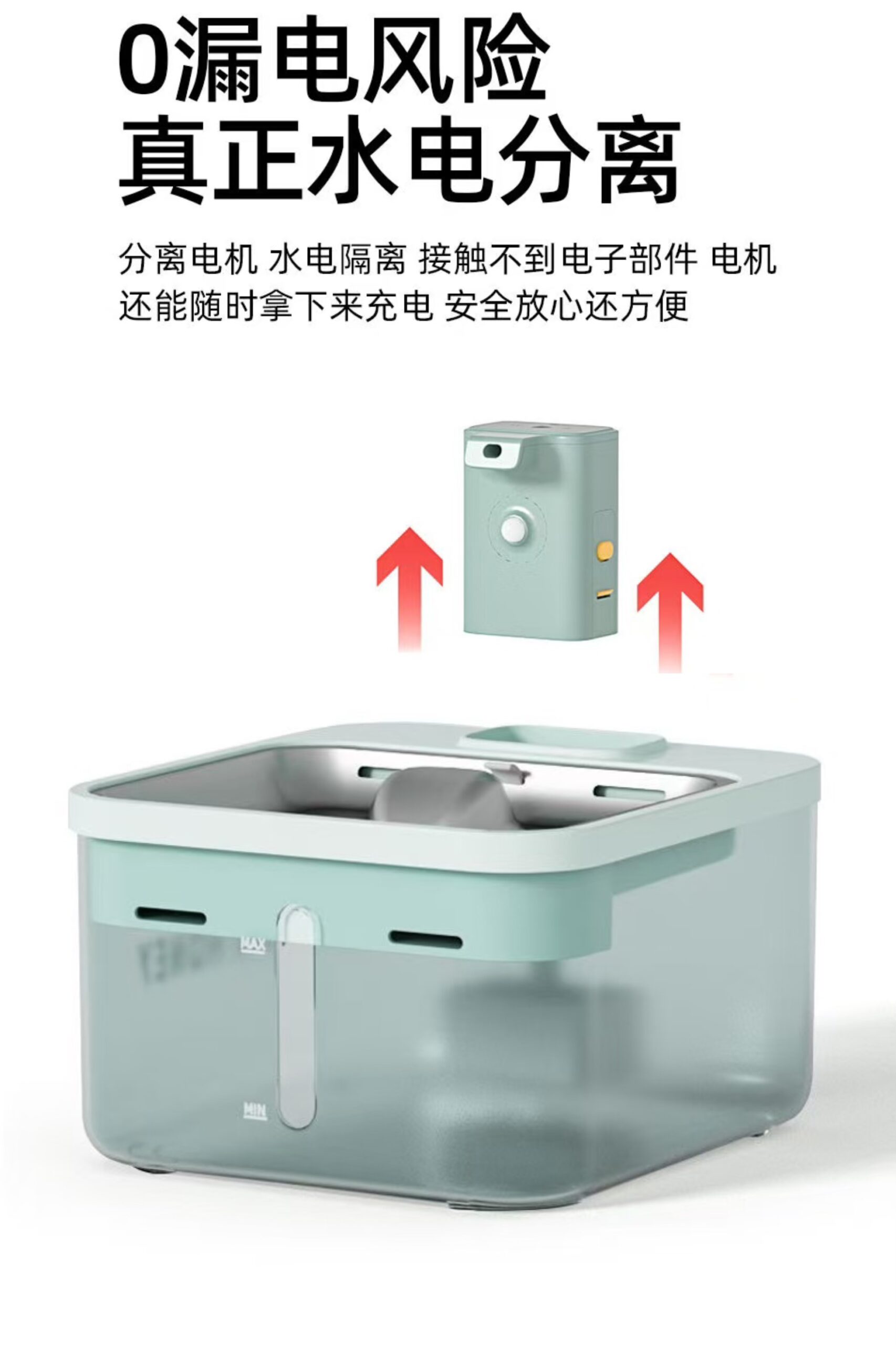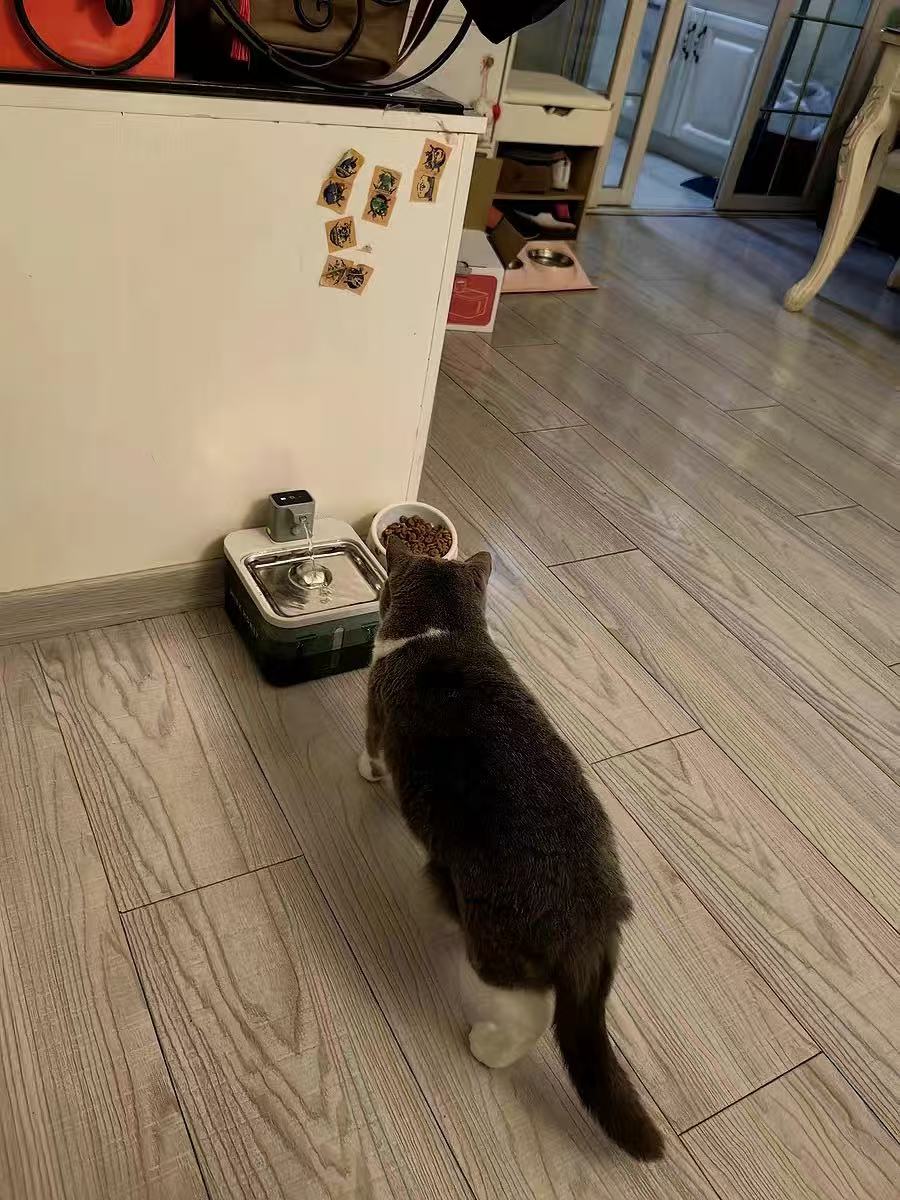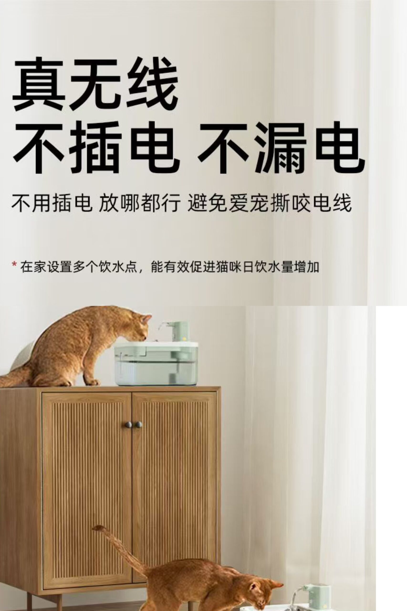 飲水機無線的,可以充電使用也可插電使用,放哪裡都行,貓咪還不會咬線;